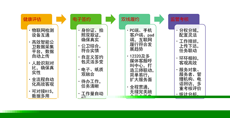 家庭醫(yī)生簽約平臺(tái)是實(shí)施家庭健康管理的服務(wù)平臺(tái),它在社區(qū)范圍內(nèi),以家庭為單位,由社區(qū)衛(wèi)生服務(wù)中心和區(qū)域醫(yī)療衛(wèi)生協(xié)同服務(wù)體系提供支撐,建立居民健康檔案為分級(jí)診療制度建設(shè)逐步形成基層首診、雙向轉(zhuǎn)診、急慢分治、上下聯(lián)動(dòng)的分級(jí)診療和就醫(yī)真正政 策落地模式,全方位的生命體征采集和檢測(cè),線上線下的數(shù)據(jù)干預(yù),為家庭成員提供綜合、連續(xù)、有效的基本衛(wèi)生服務(wù)。